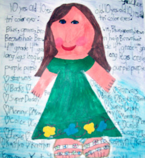 Today we worked on the cutest self portraits ever! Now, this idea is not specifically an Art Journal page, but I converted it to fit in our journals. Here is the link for the how to: http://www.artprojectsforkids.org/2009/08/my-summer-self-portrait.html