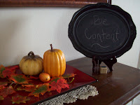 This new chalkboard started out as a picture frame. I painted the frame black, flipped over the back insert and coated it 3 times with chalk board paint. The pumpkins and leaves came from The Dollar Store. It was simple and inexpensive.