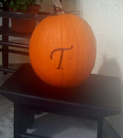 The simple black stool, I found on Craig’s List. It was brown with red and blue beads glued to the side when I purchased it. I spray painted it black and now it is the perfect perch form my Monogram Pumpkin. I saw this on another blog and had to give it a try. I really wish I could remember the name so I could give due credit of my inspiration. I made my own stencil and used a black Sharpie pen to color in the “T”. It took me about 5 minutes to do this!